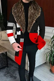 Ombre Fur Collar Geometric Color Block Splicing Mid Length Coat