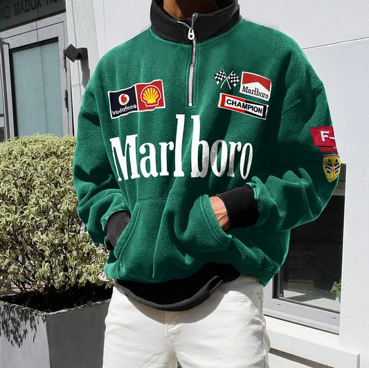 Oversized Hoodie Racing Graphic Print Color Contrast Zip-Up Hooded Sweatshirt