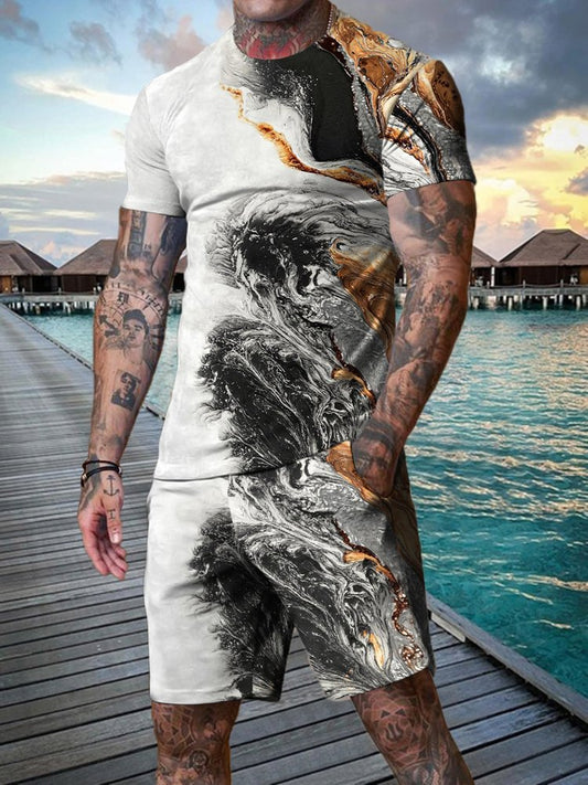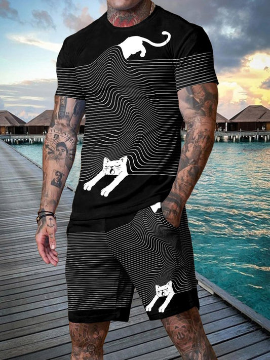 Black and White Geometric Print Round Collar Short Sleeve Suit