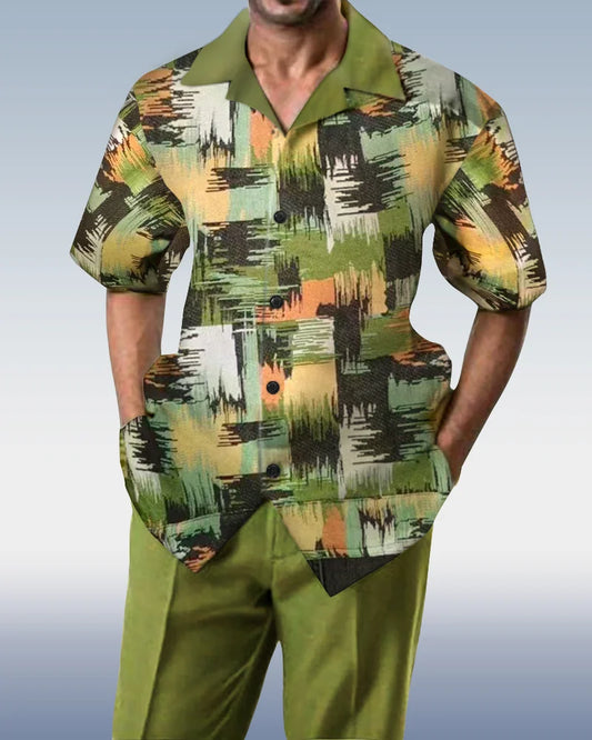 Textured Two-Piece Short Sleeve Printed Walking Pants
