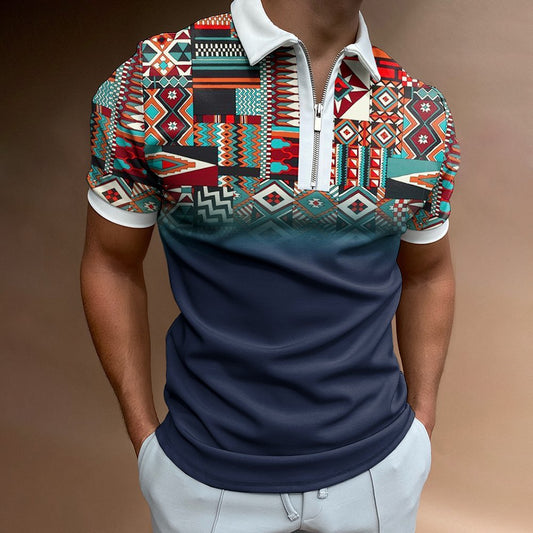 Casual Western Ethnic Pattern Print Short Sleeve Zipper Polo Shirt