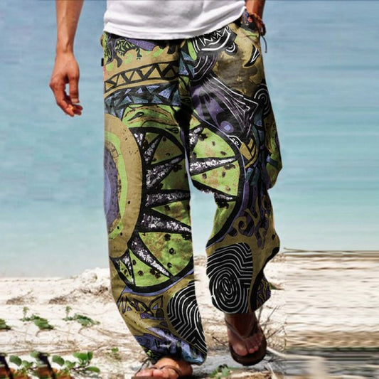 Linen Western Ethnic Irregular Boho Print Double Pocket Stretch Loose Pants