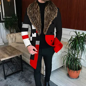 Ombre Fur Collar Geometric Color Block Splicing Mid Length Coat