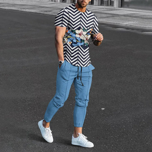 Ensemble t-shirt et pantalon hawaïen à imprimé floral rayé pour hommes