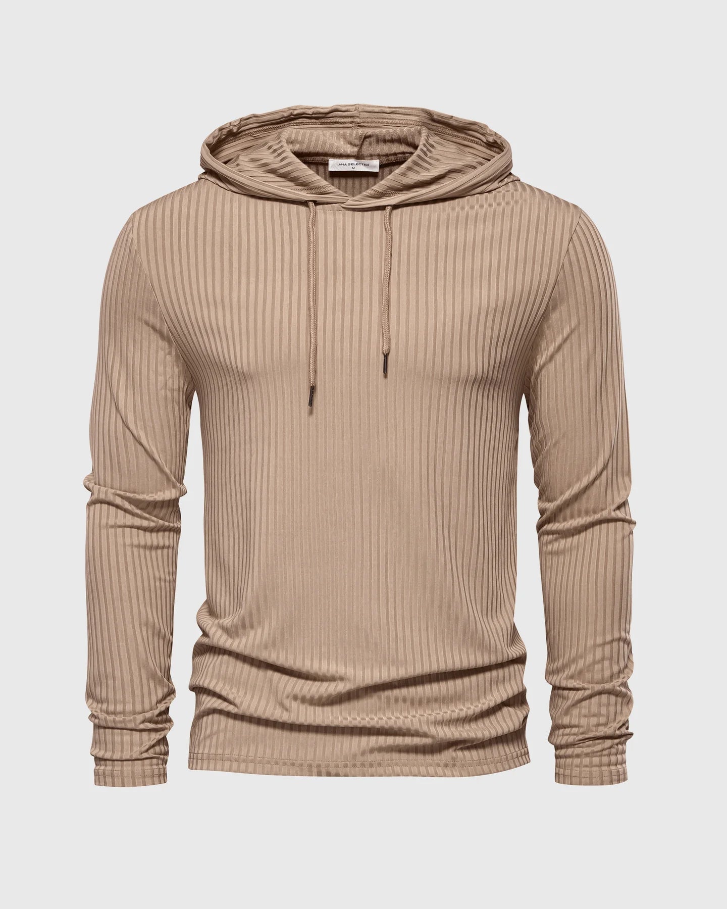 This is a mens pullover rib knit long-sleeve hoodie made of stretch breathable fabric. Versatile Everyday style.