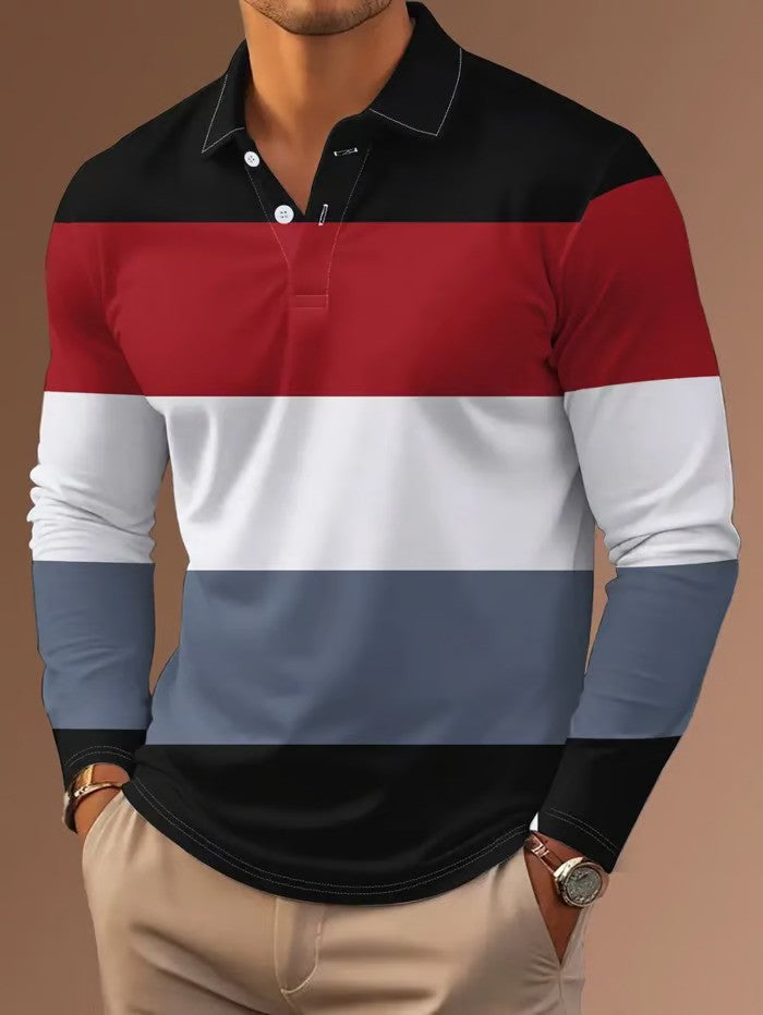 Solid Striped Lapel Long Sleeve Polo Shirt