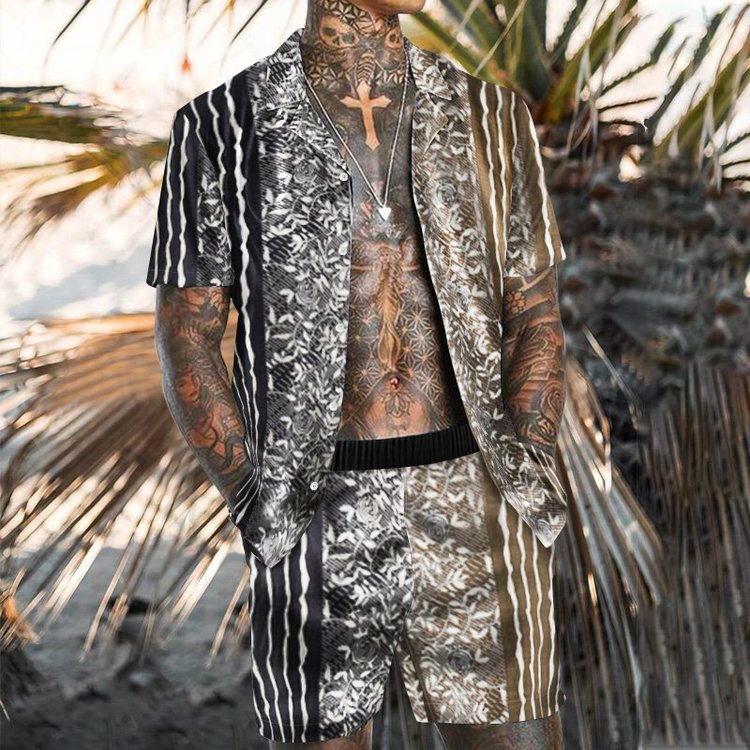 Casual Black and Brown Geometric Print Beach Suit