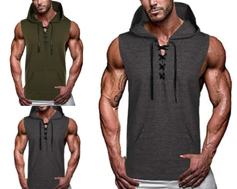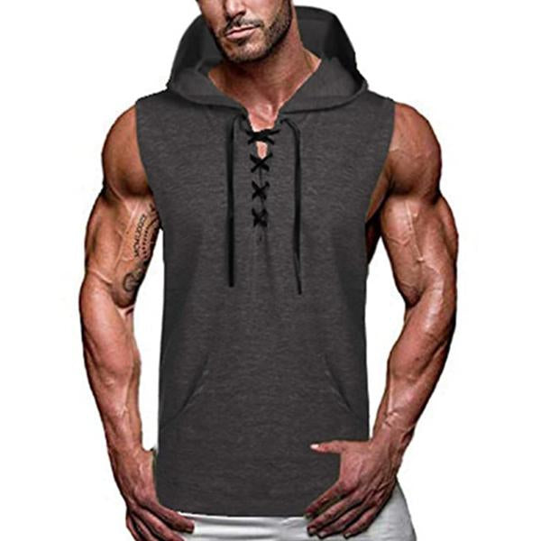 These tank top are finished with lace-up neck, hooded collar and one kangaroo pocket, a blend of fashion and functionality. This is no reason to limit you from wearing this men’s casual hooded solid color lace-up vest.