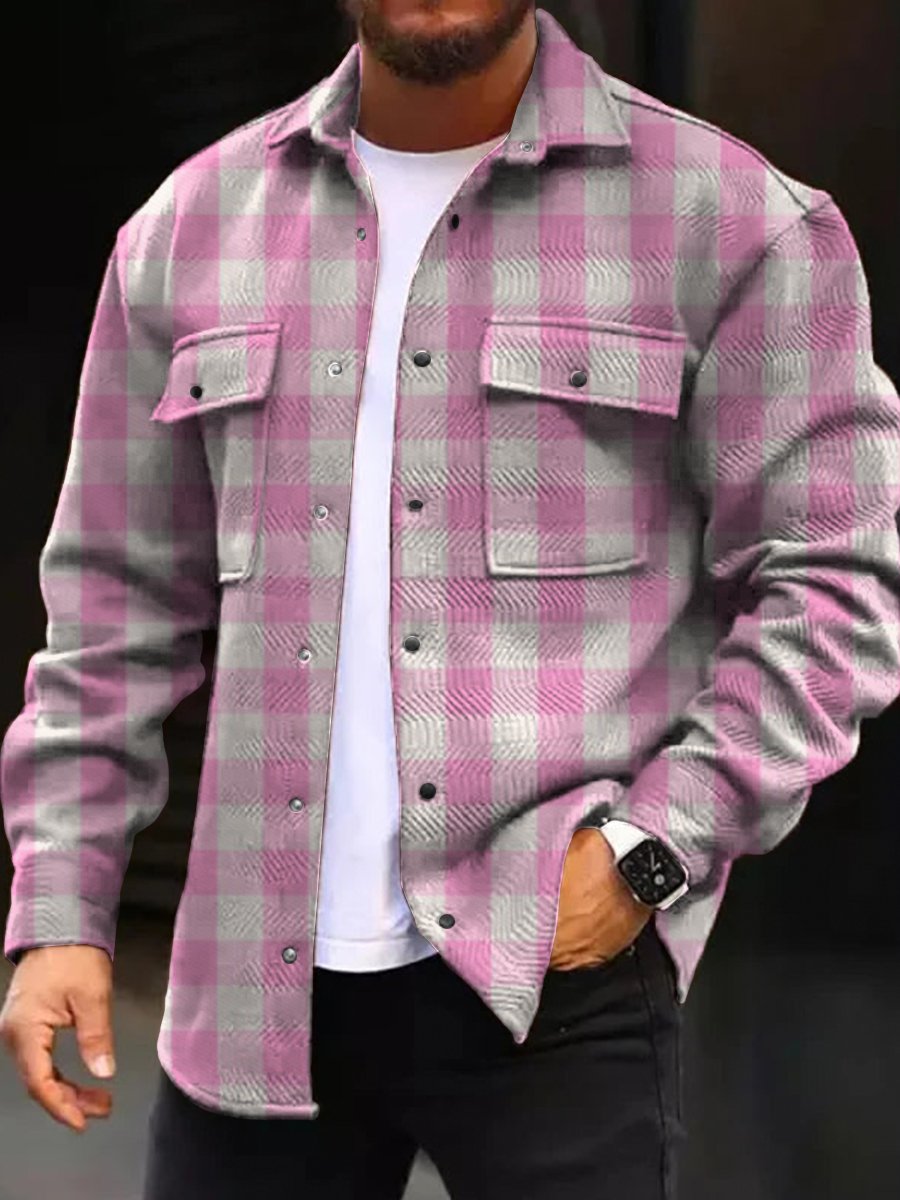 Casual Jackets Doll Style Pink Plaid Long Sleeve Pocket Jacket