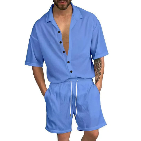 Introducing our Men's Casual Solid Color Lapel Short Sleeve Shirt Drawstring Shorts Set, a stylish and versatile outfit option for your casual wear collection. This set features a comfortable short sleeve shirt and drawstring shorts, offering a coordinated and fashionable look.