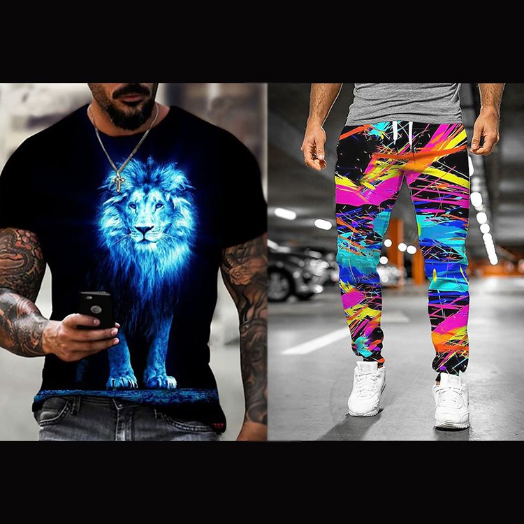 Fashion Casual Blue Lion Print Short Sleeve Suit