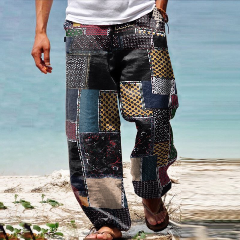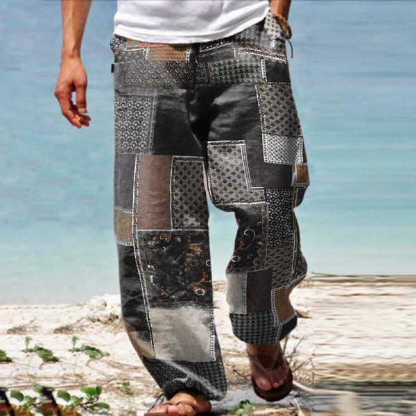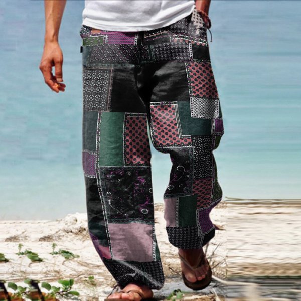 Linen Western Ethnic Irregular Boho Print Double Pocket Stretch Loose Pants