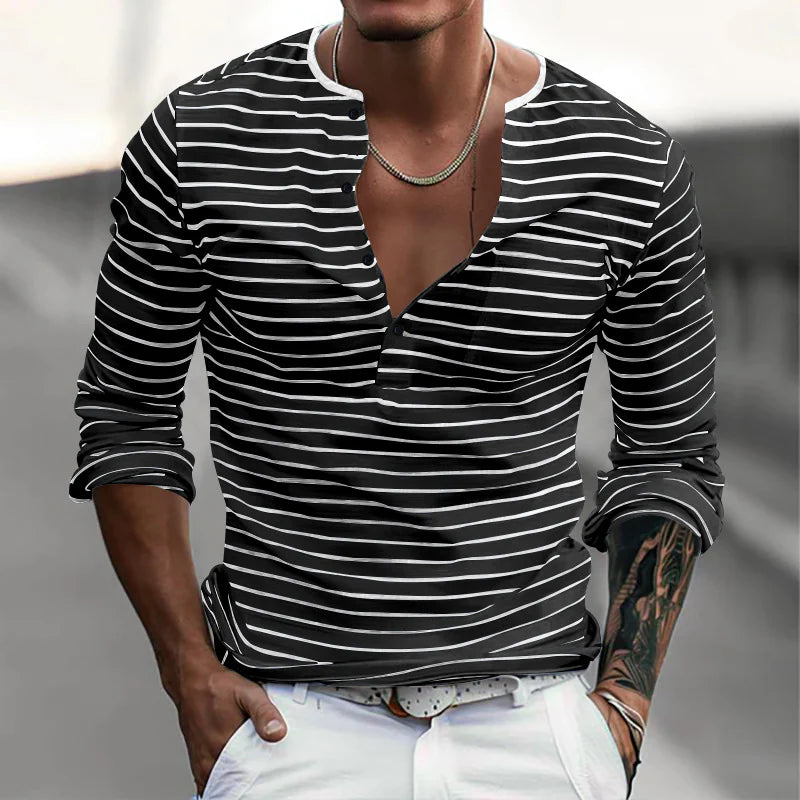 Striped Henley Collar Long Sleeve Casual T-shirt