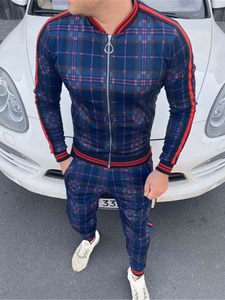 Stylish Casual Blue Checked Print Sports 2 Piece Set