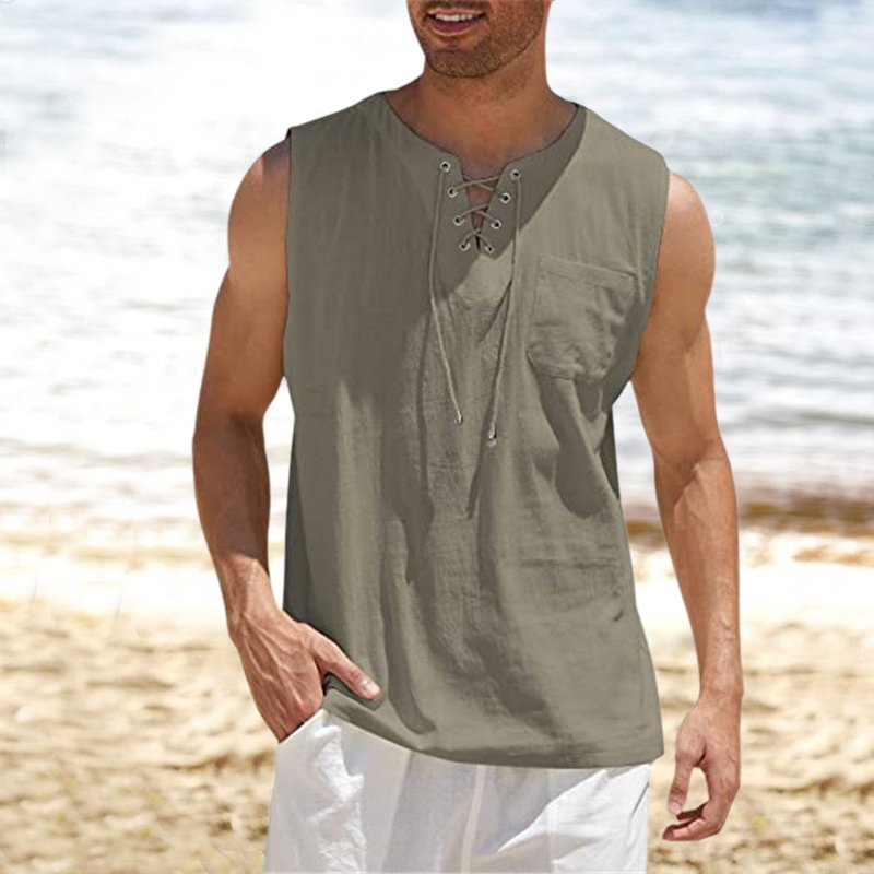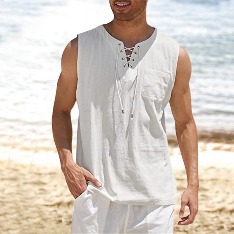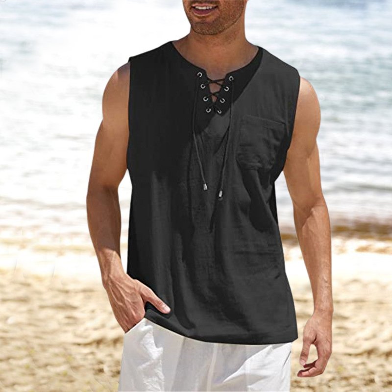 Tank Top Shirt Lace-Up Solid Linen Short Sleeve T-Shirt