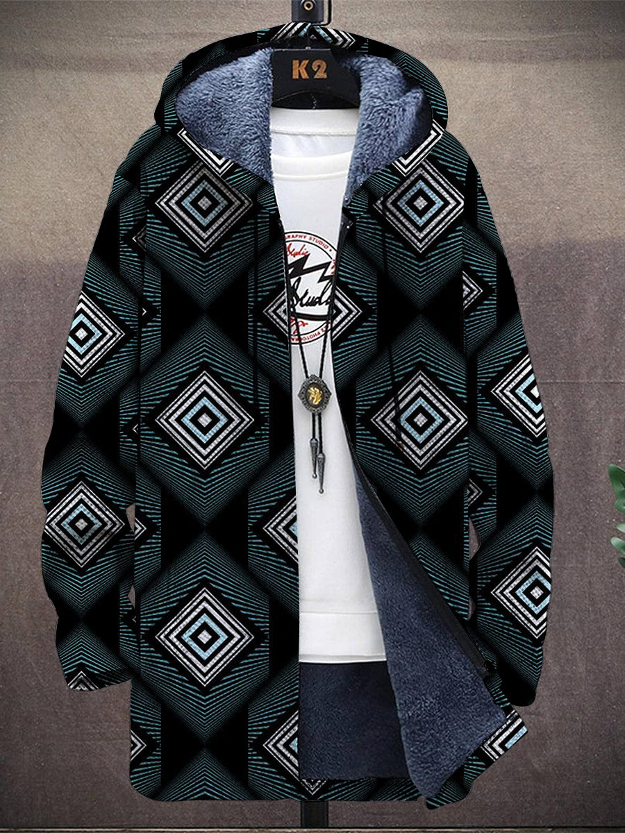 Vintage Geometric Pattern Hooded Two-Pocket Fleece Jacket