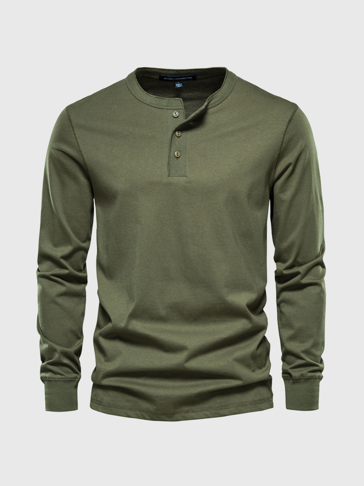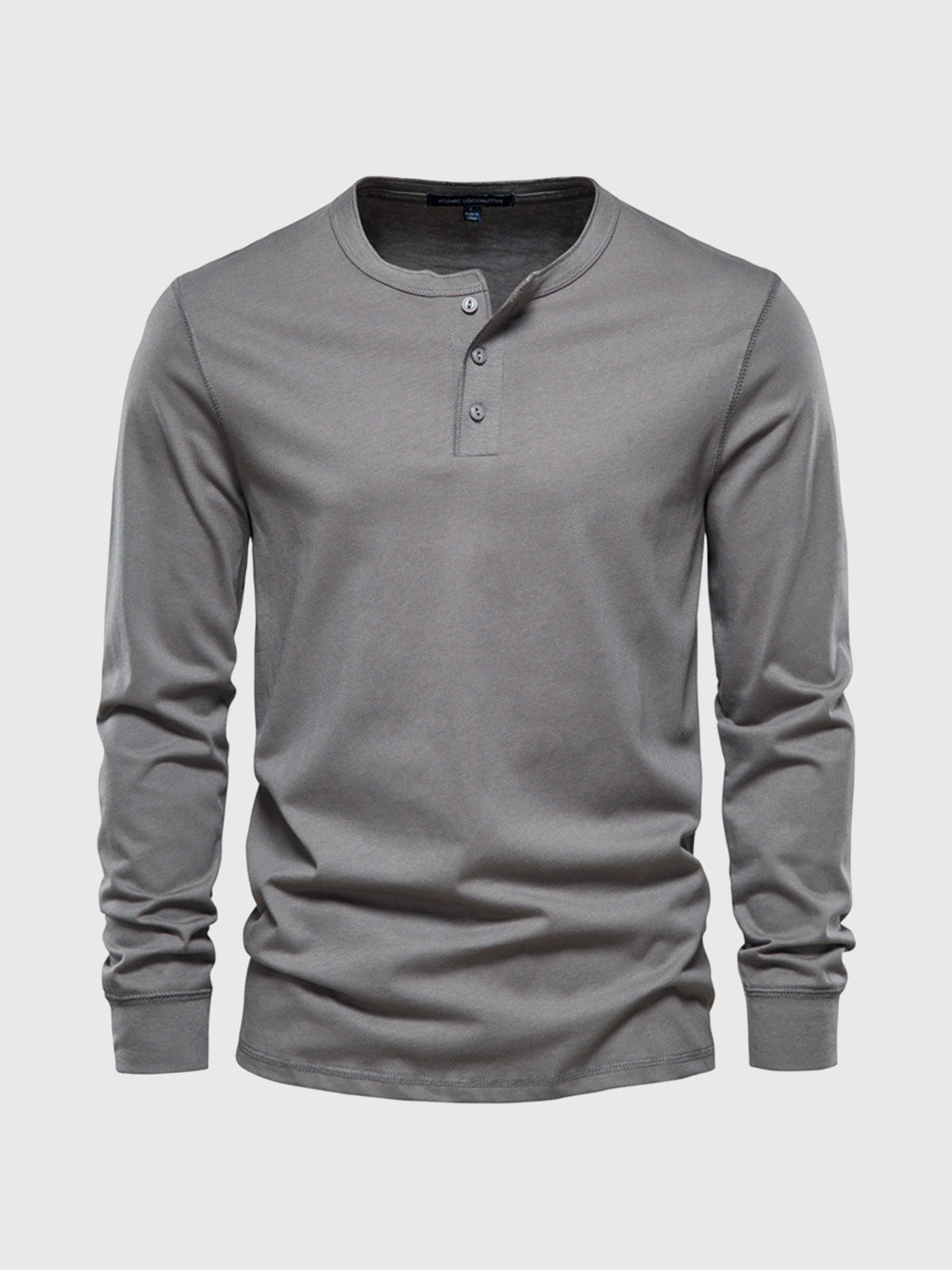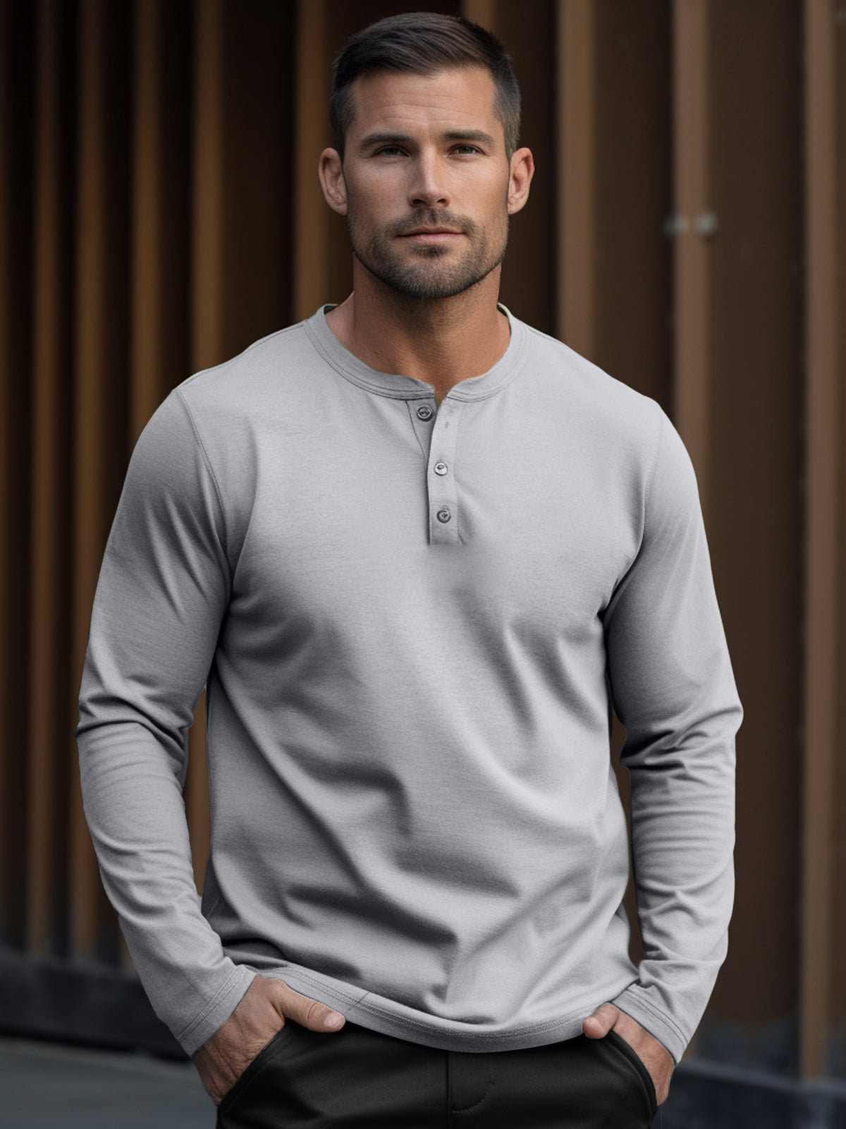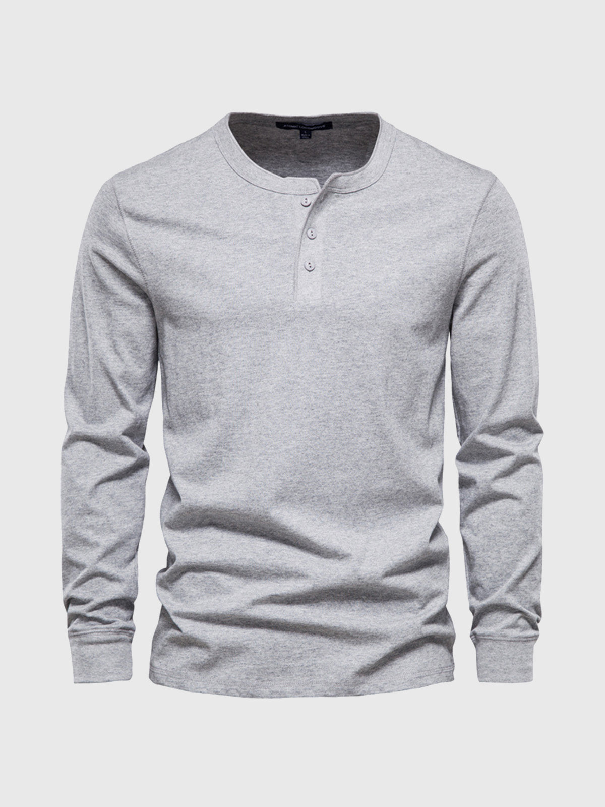 This is a cotton henley pullover long sleeve T-shirt in stretch breathable fabric with a stylish curved hem for versatile everyday style.