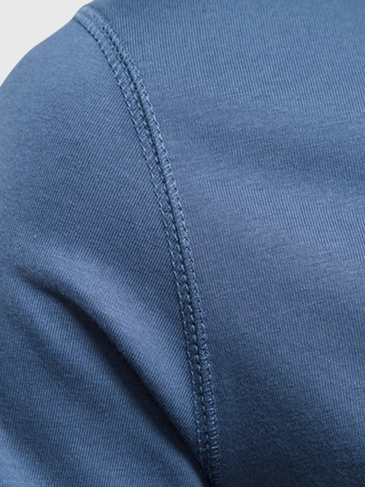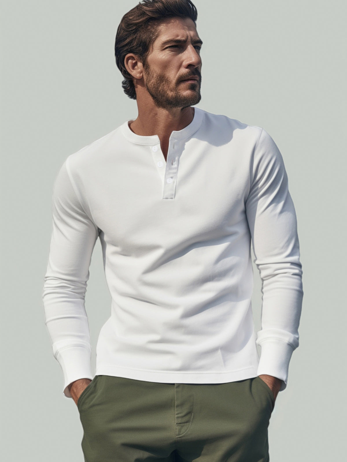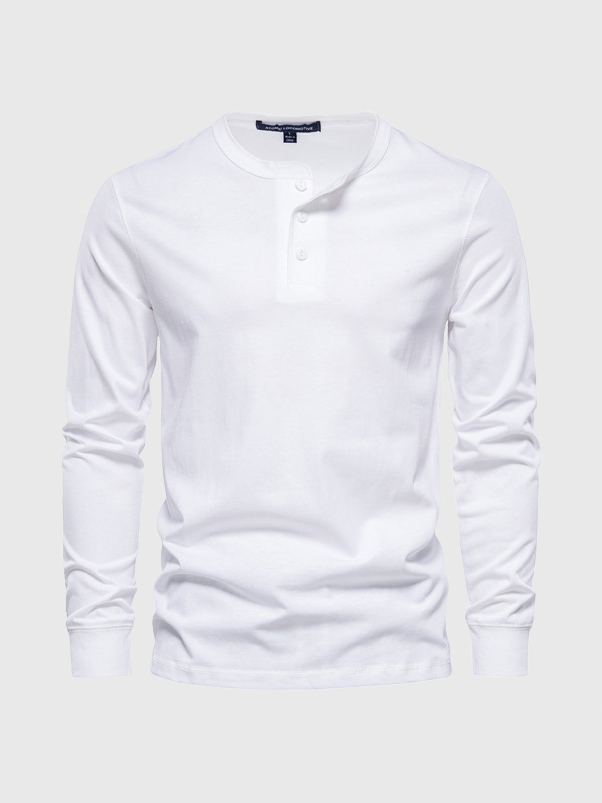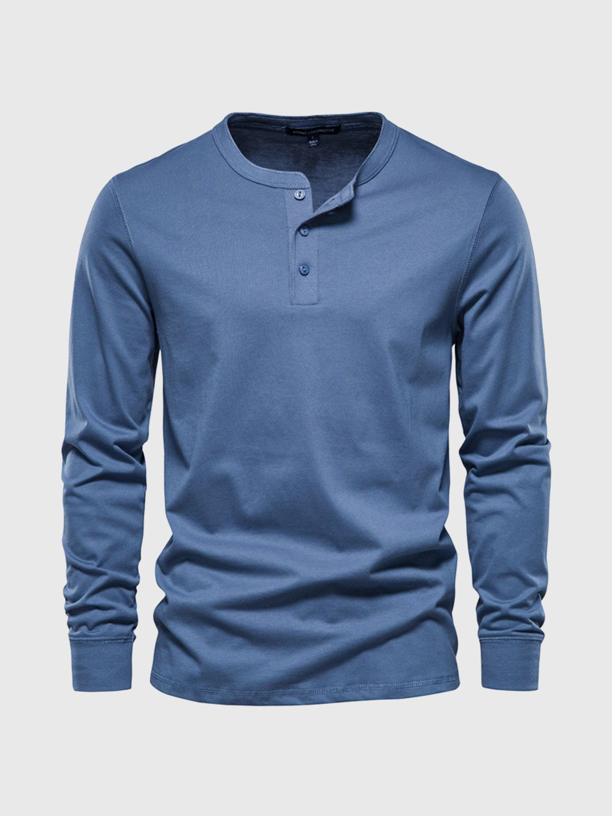 This is a cotton henley pullover long sleeve T-shirt in stretch breathable fabric with a stylish curved hem for versatile everyday style.