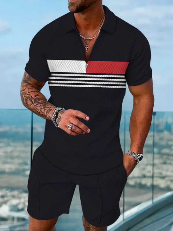 This men's casual two-piece set is the perfect combination of comfort and style, designed for the warmer seasons of spring and summer. Made from a high-quality blend of 100% cotton and polyester, the fabric ensures a soft feel while being breathable and durable for all-day wear. Featuring a bold geometric print, this set offers a unique, modern look that stands out in any casual or sporty setting. The round-neck design and short sleeves provide a relaxed and comfortable fit, ideal for various occasions like casual outings, sports, or weekend get-togethers.