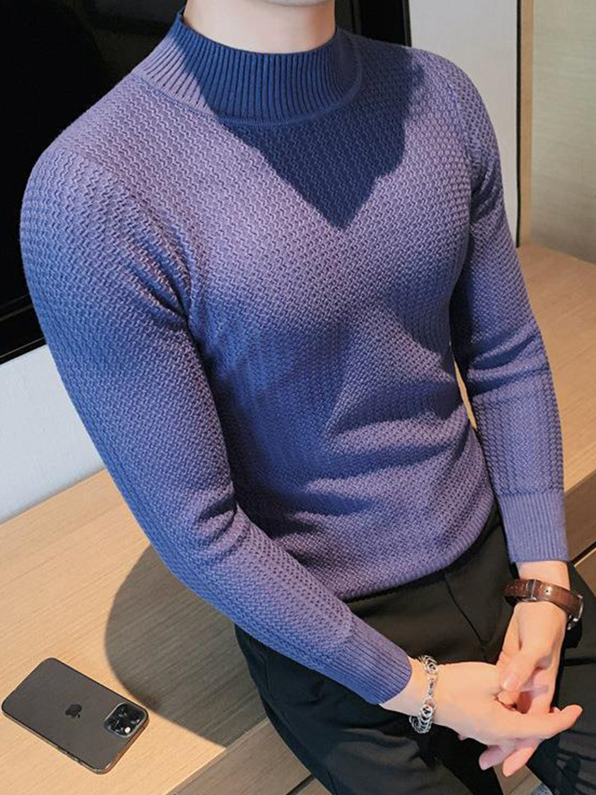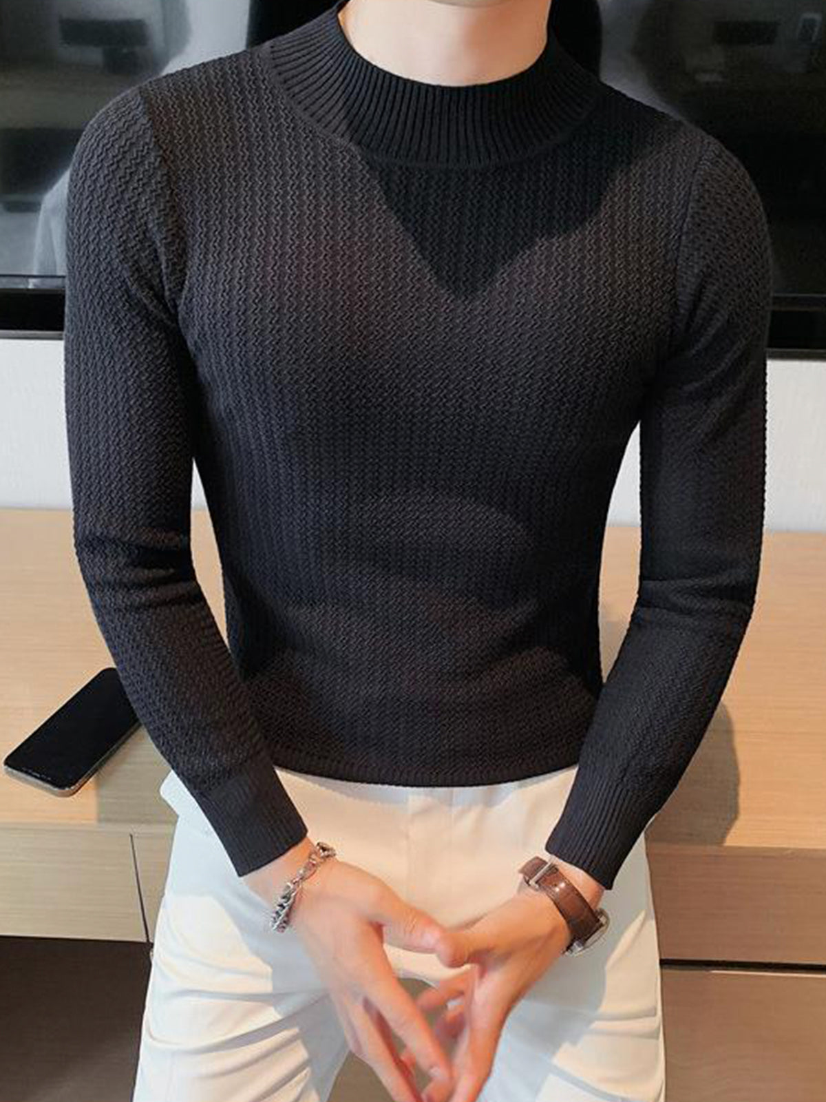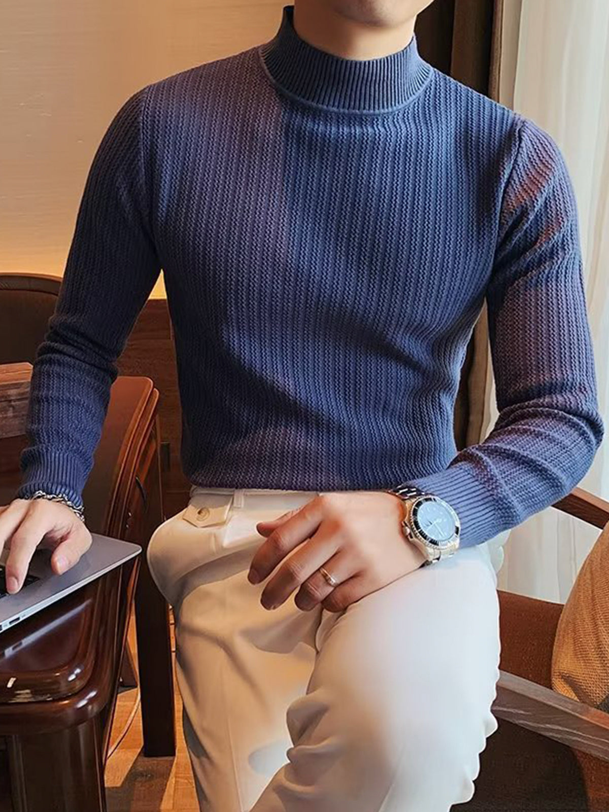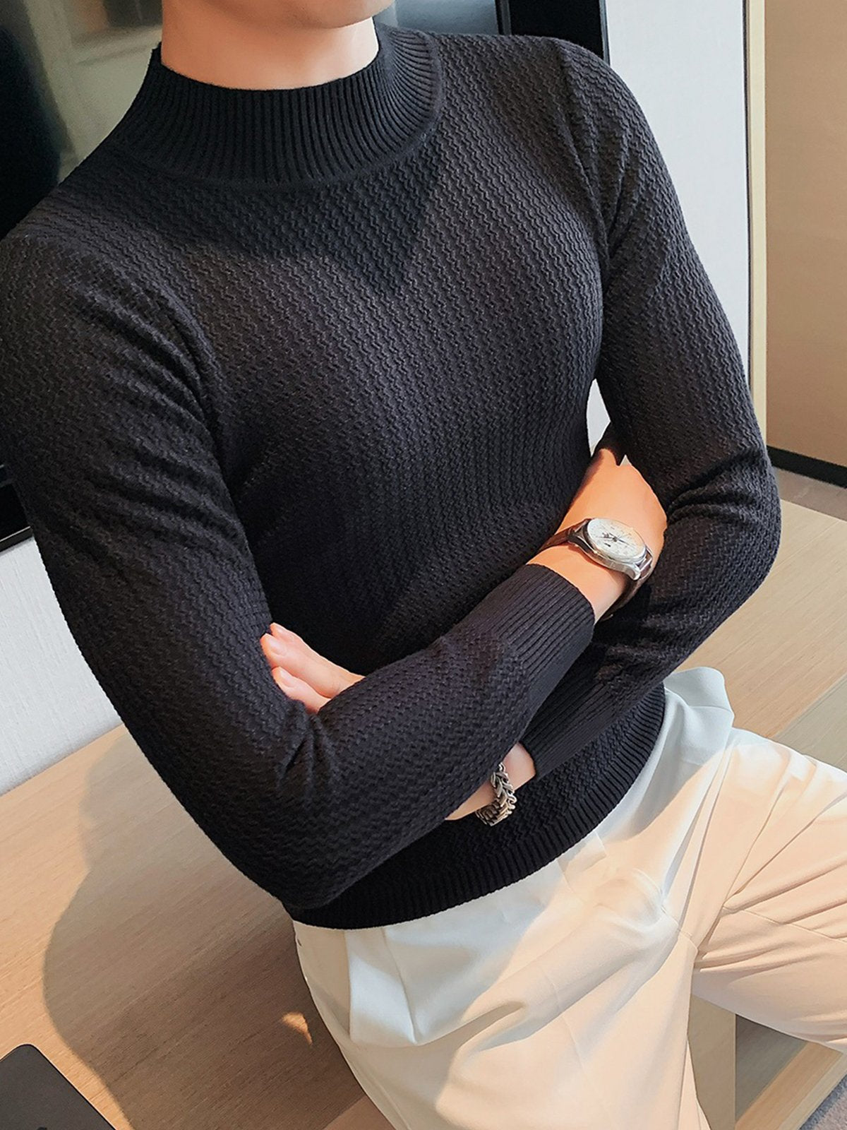 This is a regular-fit mock-neck texture baselayer sweater. It's made with viscose, polyester, and nylon. 360° stereoscopic cutting, in line with the male body shape, comfortable and stylish in one.