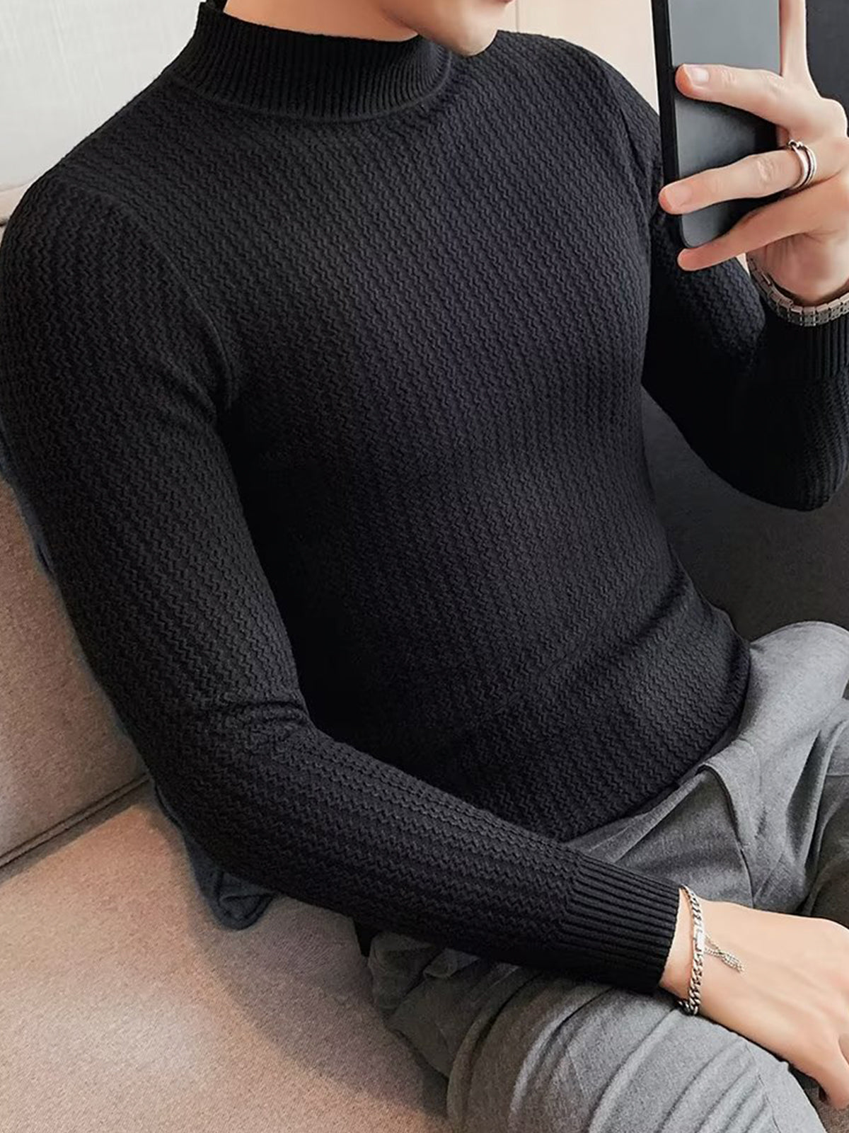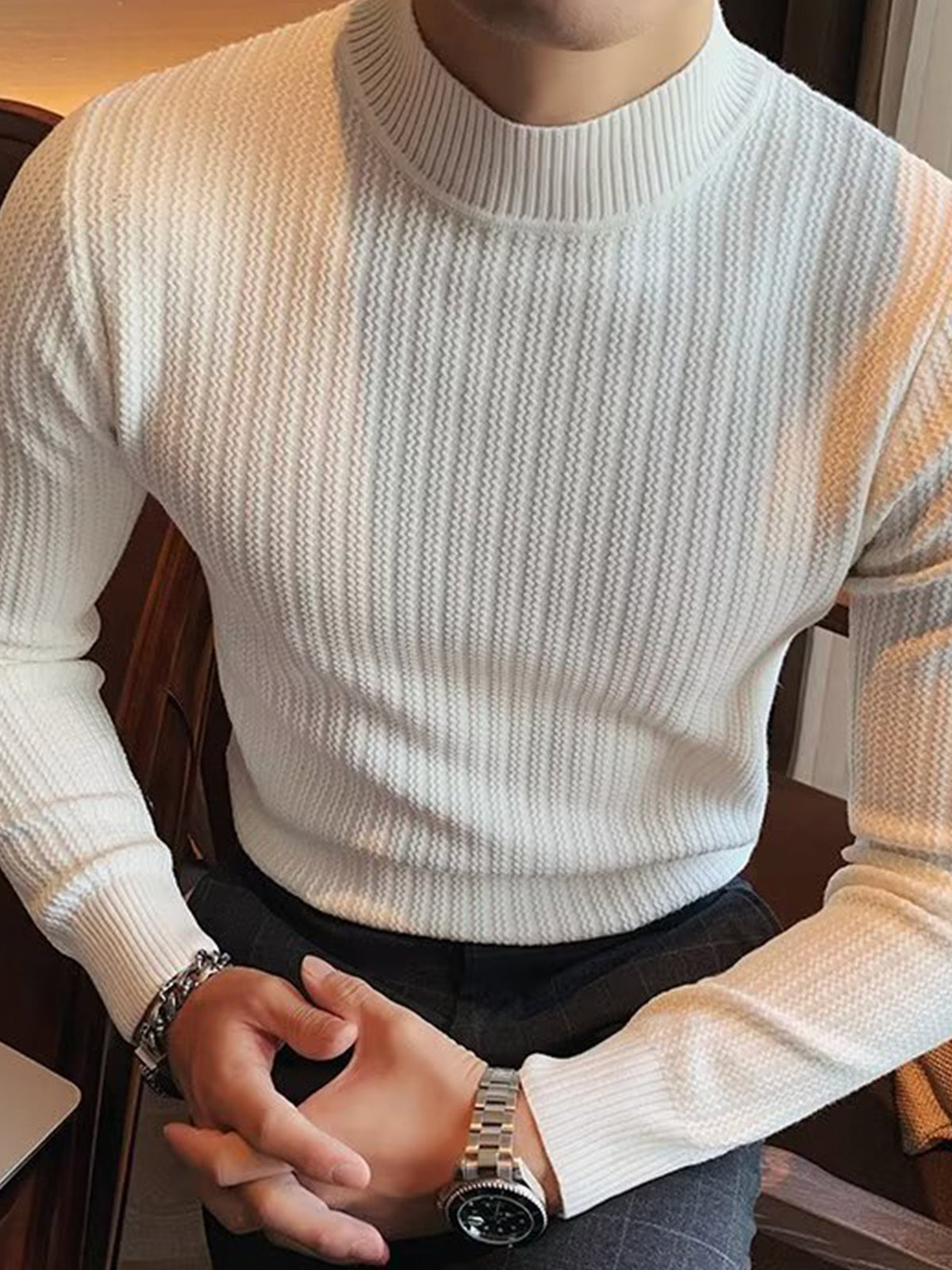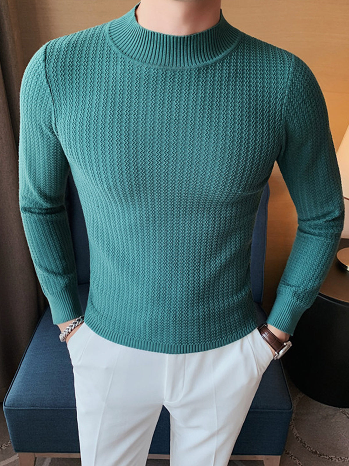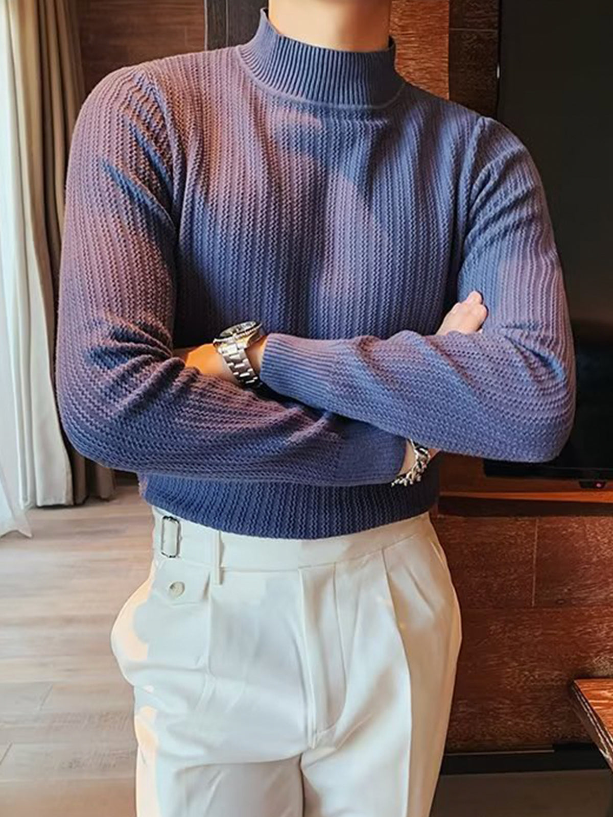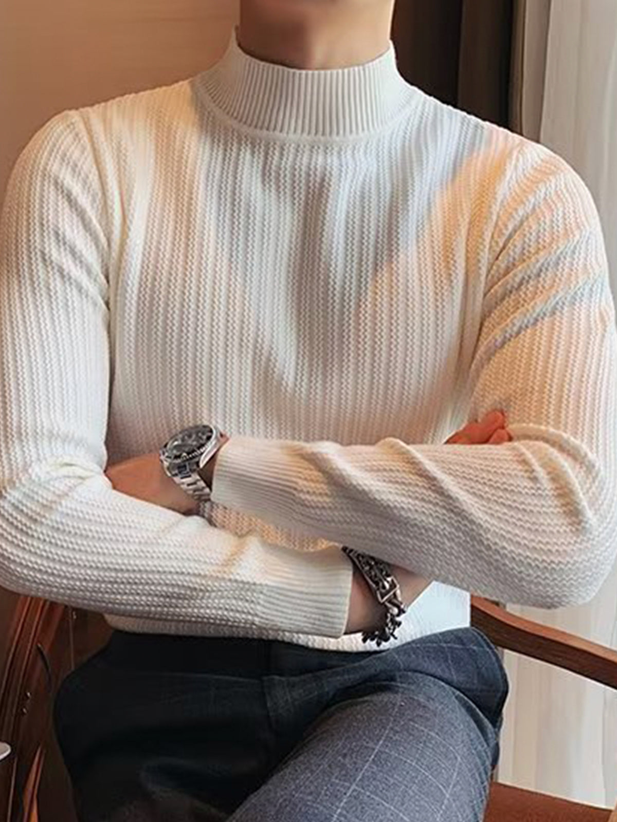 This is a regular-fit mock-neck texture baselayer sweater. It's made with viscose, polyester, and nylon. 360° stereoscopic cutting, in line with the male body shape, comfortable and stylish in one.