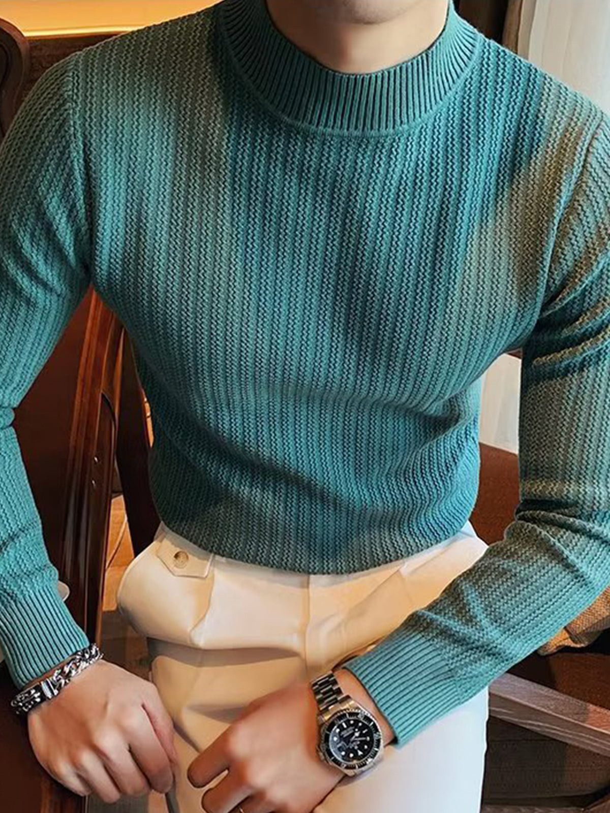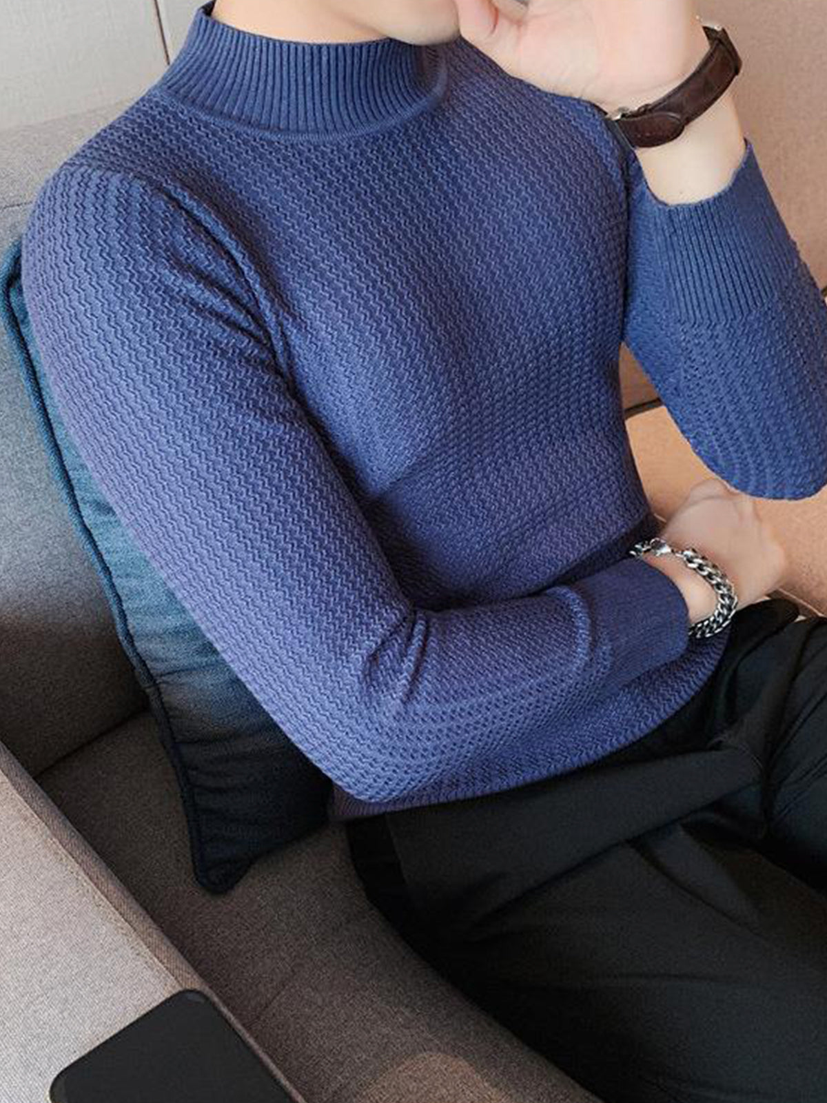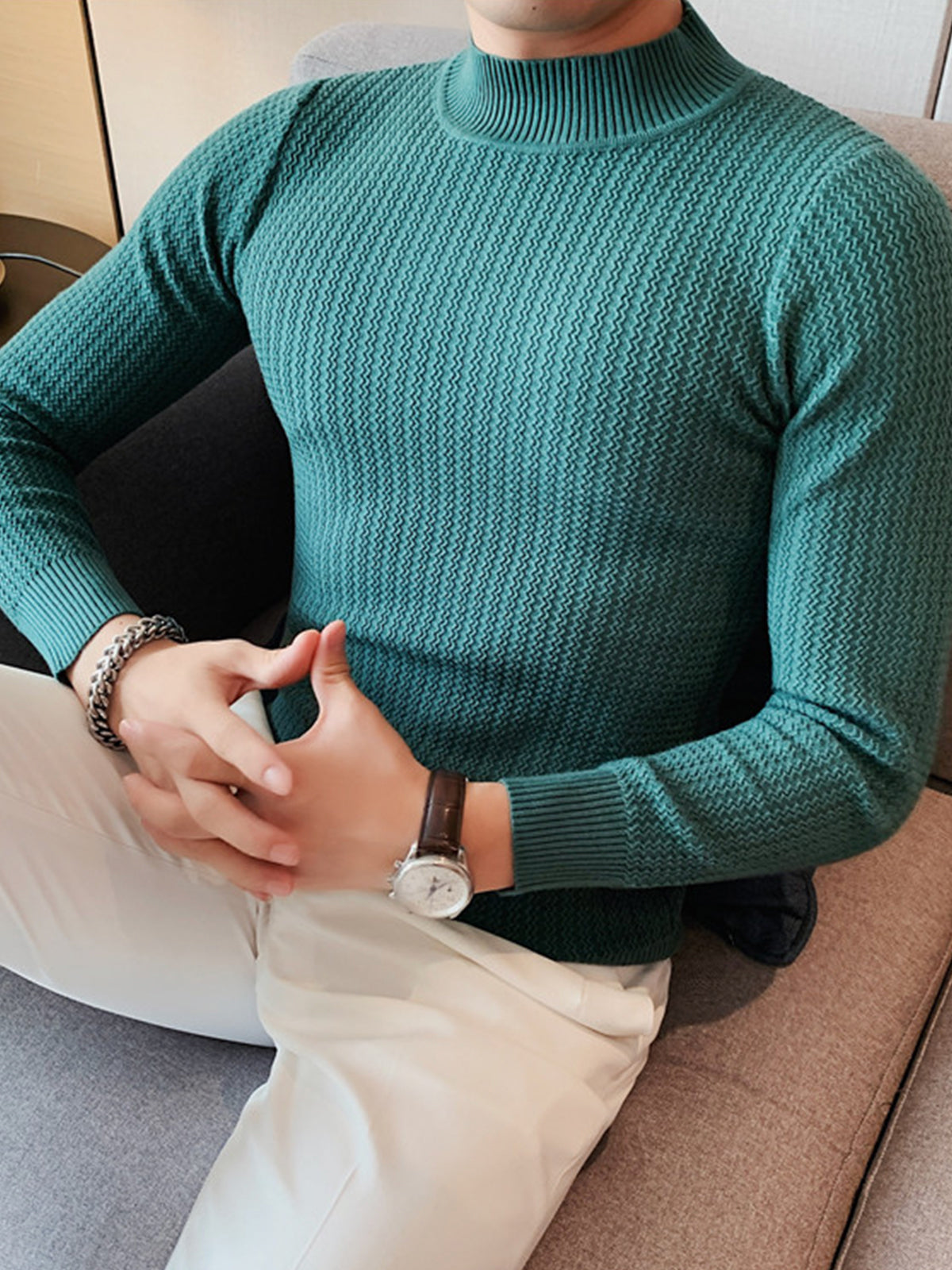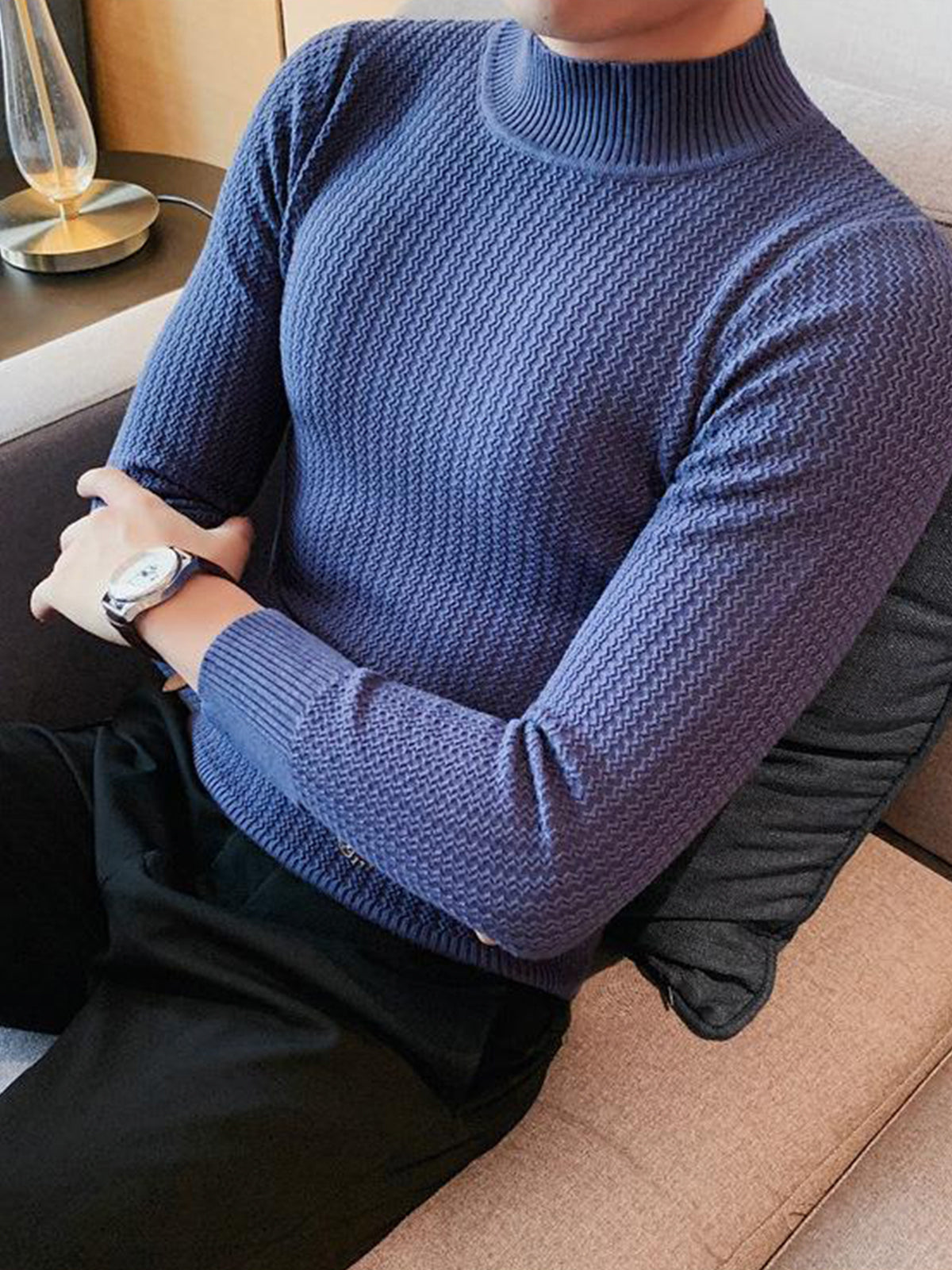 This is a regular-fit mock-neck texture baselayer sweater. It's made with viscose, polyester, and nylon. 360° stereoscopic cutting, in line with the male body shape, comfortable and stylish in one.
