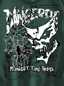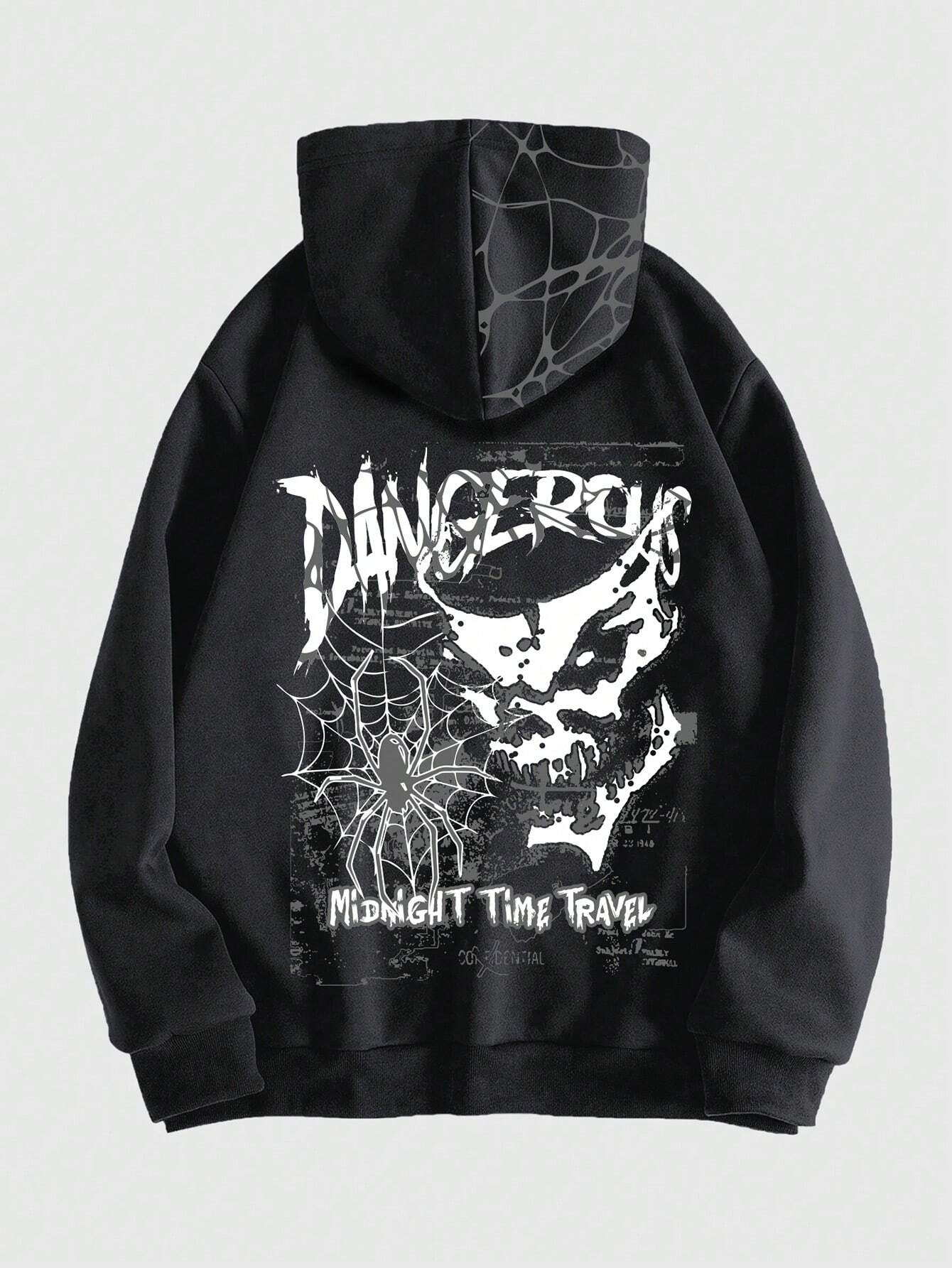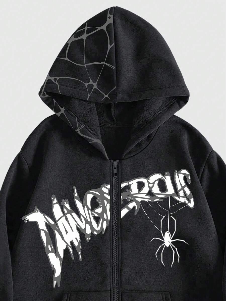 ROMWE Grunge Punk Letter & Spider Printed Zipper Front Hooded Sweatshirt With Long Sleeves