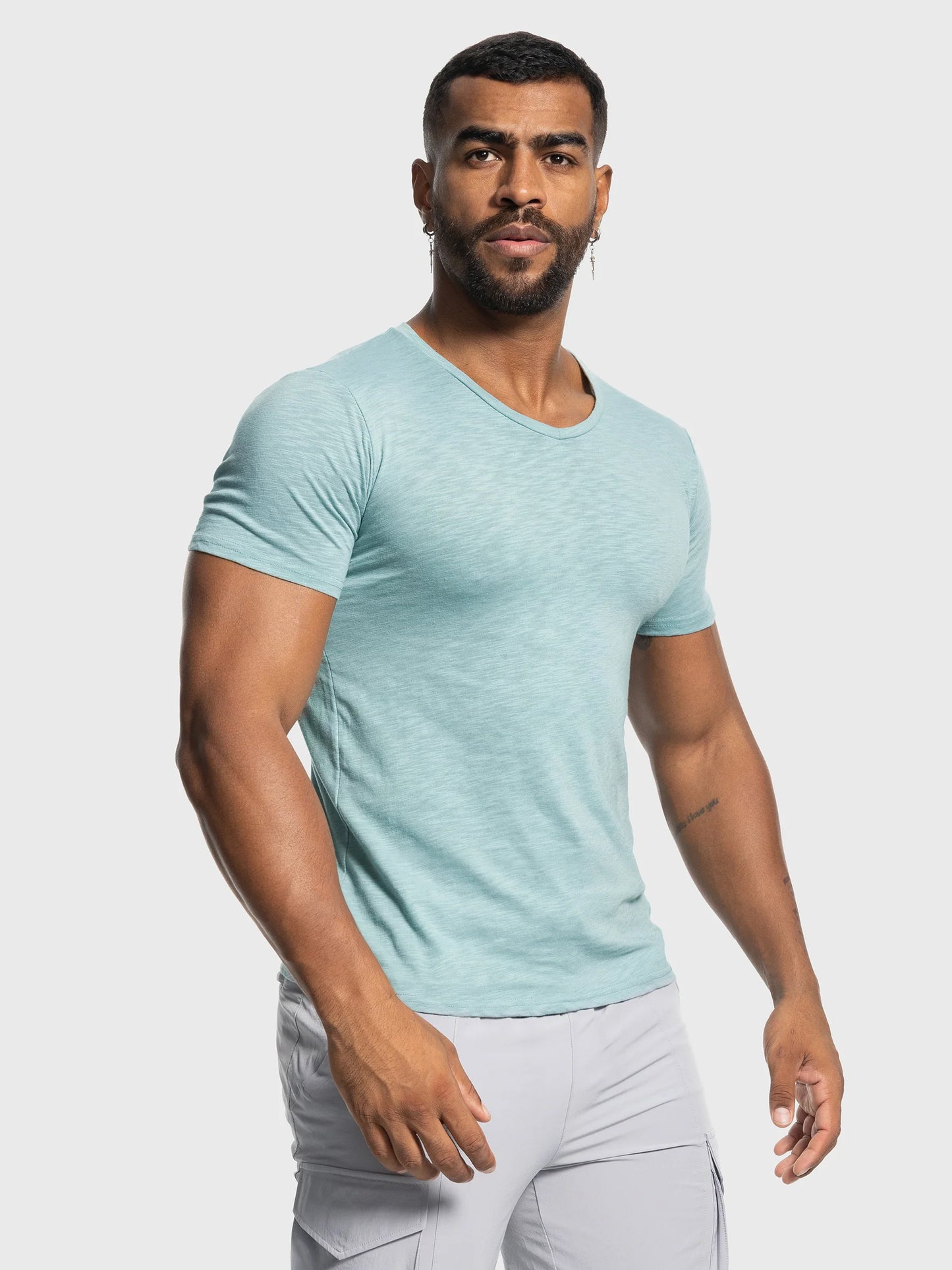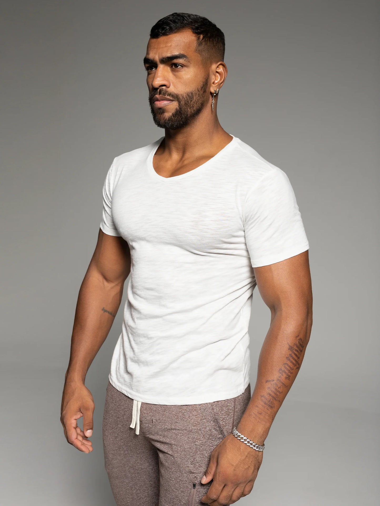 The V-neck slub cotton short sleeve T-shirt is a must for those who seek every day sexiness and style. Crafted from light weight, 4 way stretch fabrics that promotes comfort and breathability, also guarantees the smoothness for all types of movements. The V neck opening shows off the collarbones perfectly and brings openness to your charm. The versatile fit enhances any types of body shape to its tip top. Smoothly operating from daily activities to a fun night out.