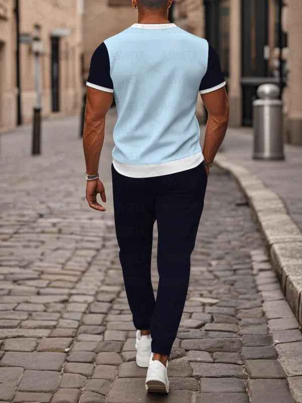 This men's casual two-piece set is the perfect combination of comfort and style, designed for the warmer seasons of spring and summer. Made from a high-quality blend of 100% cotton and polyester, the fabric ensures a soft feel while being breathable and durable for all-day wear. Featuring a bold geometric print, this set offers a unique, modern look that stands out in any casual or sporty setting. The round-neck design and short sleeves provide a relaxed and comfortable fit, ideal for various occasions like casual outings, sports, or weekend get-togethers.