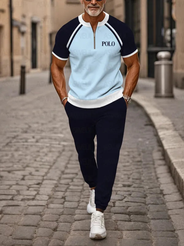 Zipper Short Sleeve Long Pants Two-Piece Set
