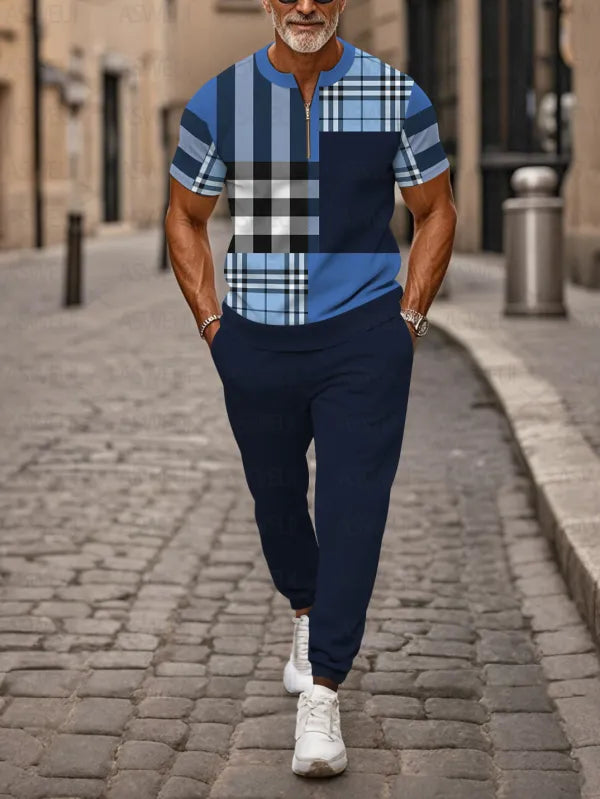 This men's casual two-piece set is the perfect combination of comfort and style, designed for the warmer seasons of spring and summer. Made from a high-quality blend of 100% cotton and polyester, the fabric ensures a soft feel while being breathable and durable for all-day wear. Featuring a bold geometric print, this set offers a unique, modern look that stands out in any casual or sporty setting. The round-neck design and short sleeves provide a relaxed and comfortable fit, ideal for various occasions like casual outings, sports, or weekend get-togethers.