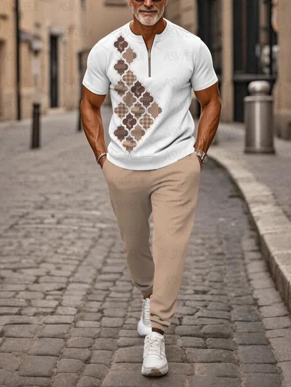 This men's casual two-piece set is the perfect combination of comfort and style, designed for the warmer seasons of spring and summer. Made from a high-quality blend of 100% cotton and polyester, the fabric ensures a soft feel while being breathable and durable for all-day wear. Featuring a bold geometric print, this set offers a unique, modern look that stands out in any casual or sporty setting. The round-neck design and short sleeves provide a relaxed and comfortable fit, ideal for various occasions like casual outings, sports, or weekend get-togethers.