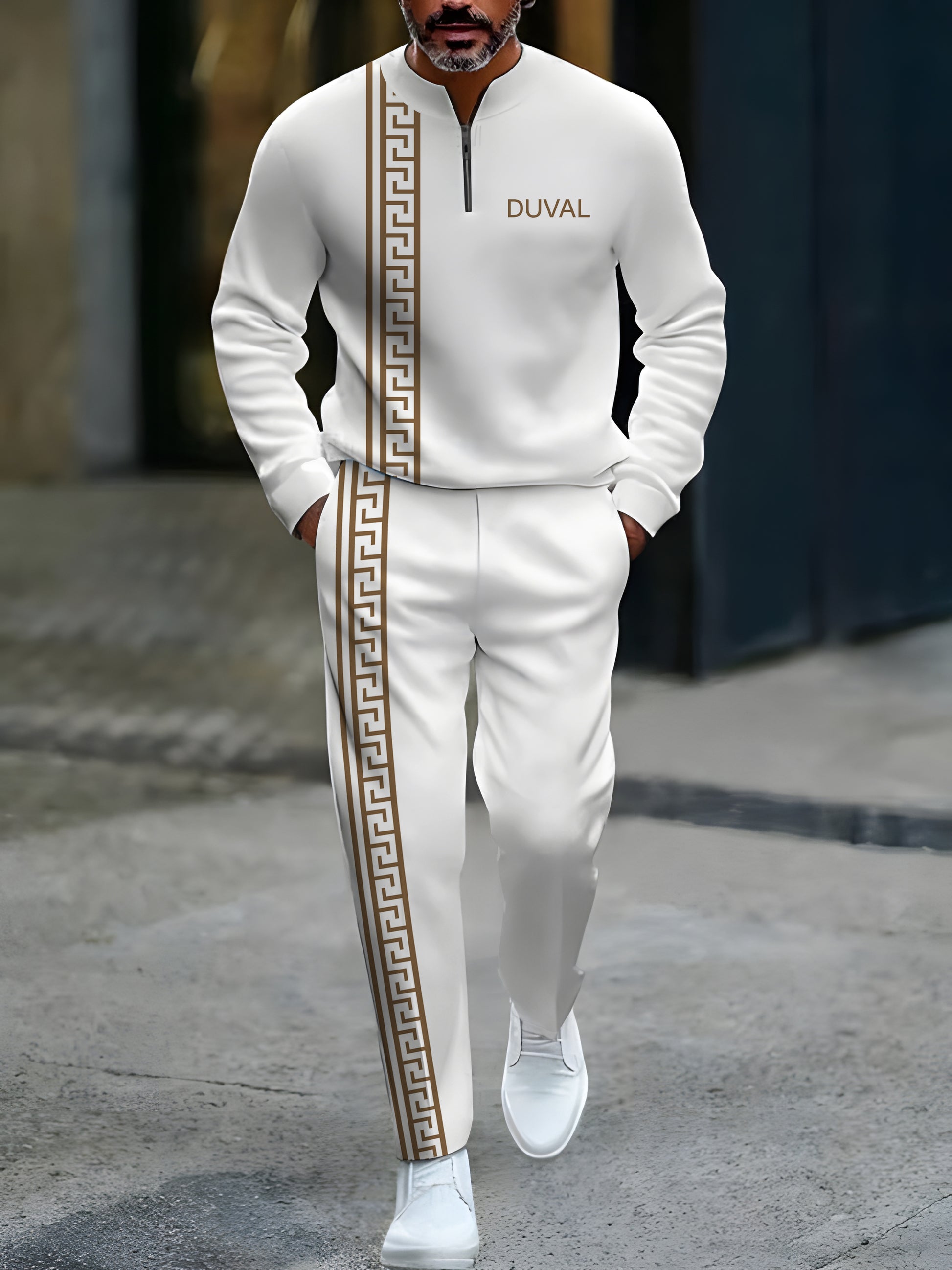 DUVAL. NORTH AMERICA Long Sleeve Zipper Two-piece Set perfectly epitomizes fashion and comfort in one. Comfortable enough for everyday wear in most seasons, the 100% polyester cotton material is lightweight and soft on the skin. Accented with contrasting color details, this set exudes playfulness with its geometrical print to add trendiness to your everyday wear. This zipper neck gives a modern touch while providing functionality. Due to its regular length and long sleeves, this ensures a classic and versatile fitting.