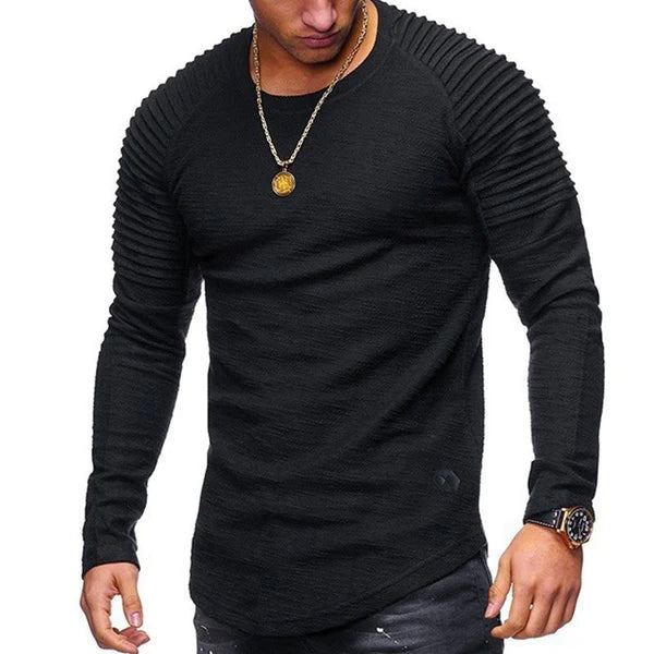 Introducing our Men's Casual Solid Color Pleated Stitching Round Neck Long Sleeve T-Shirt, a stylish and comfortable addition to your casual wardrobe. This versatile long sleeve tee is designed to provide a modern and trendy look with its unique pleated stitching and classic round neck. Here are the key features and details of this product: